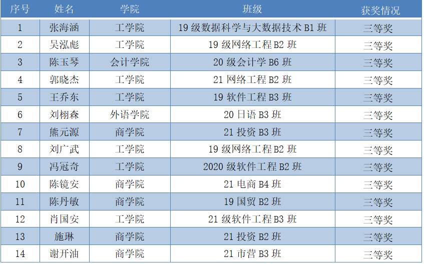 赛后由通识教育学院组织各数学教研室教师进行试卷评阅,66名学生脱颖而出,其中,一等奖3人,二等奖8人,三等奖14人,优秀奖41人。获奖名单如下: