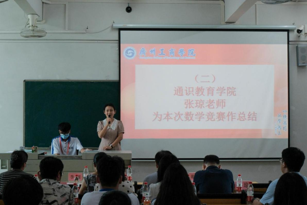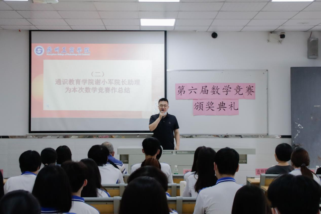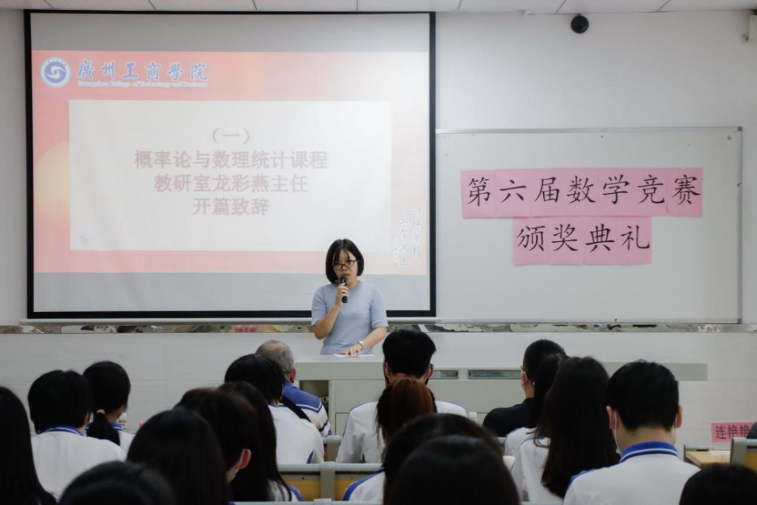在花都校区颁奖典礼上,概率论与数理统计课程教研室主任龙彩燕老师进行开篇致辞,通识教育学院院长助理谢小军老师为本次数学竞赛作总结。龙彩燕老师提到了数学竞赛的主旨是在于激发学生学习数学的积极性,对获奖同学表达了祝贺,也希望获奖同学再接再厉,在10月份的省赛中能够取得好成绩。