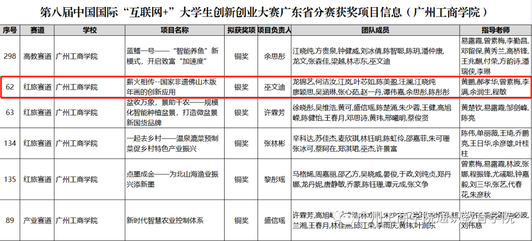 近日,第八届中国国际“互联网+”大学生创新创业大赛广东省分赛(简称:“互联网+”省赛)获奖名单公布(粤教毕函【2022】12号),《薪火相传--国家非遗佛山木版年画的创新应用》项目经过学校领导支持、指导老师们的悉心付出、项目成员坚持不懈的努力,最终获得了第八届“互联网+”大学生创新创业大赛广东省分赛银奖的好成绩!