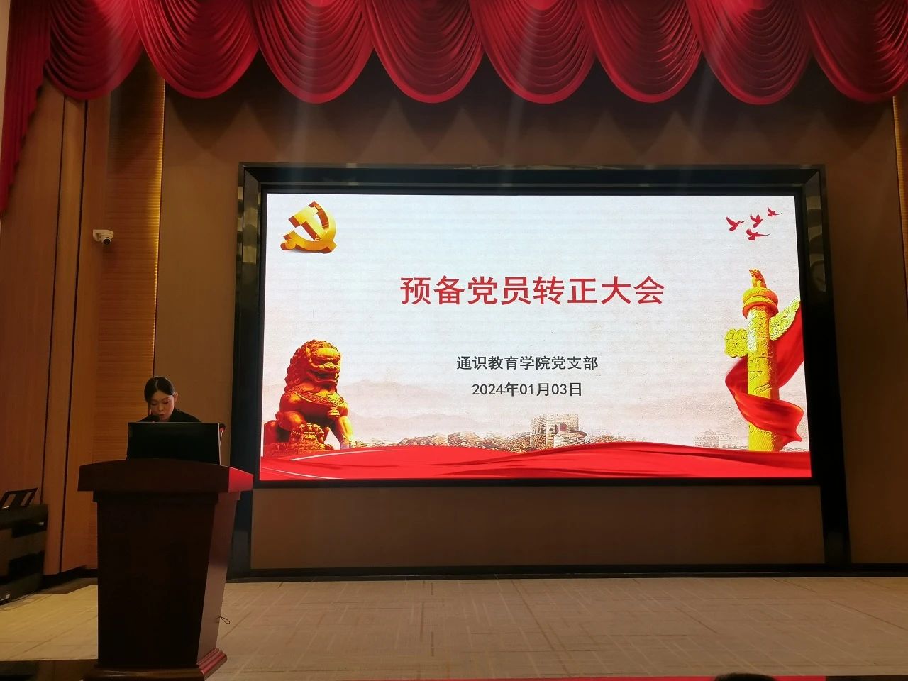 2024年1月3日上午,通识教育学院党支部于花都校区图书馆416报告厅召开支部大会,讨论杨姜维、贾利琴两名预备党员转正的相关事宜,活动由支部副书记李青主持,参加本次会议的党员有27人,具有投票权的党员25人。