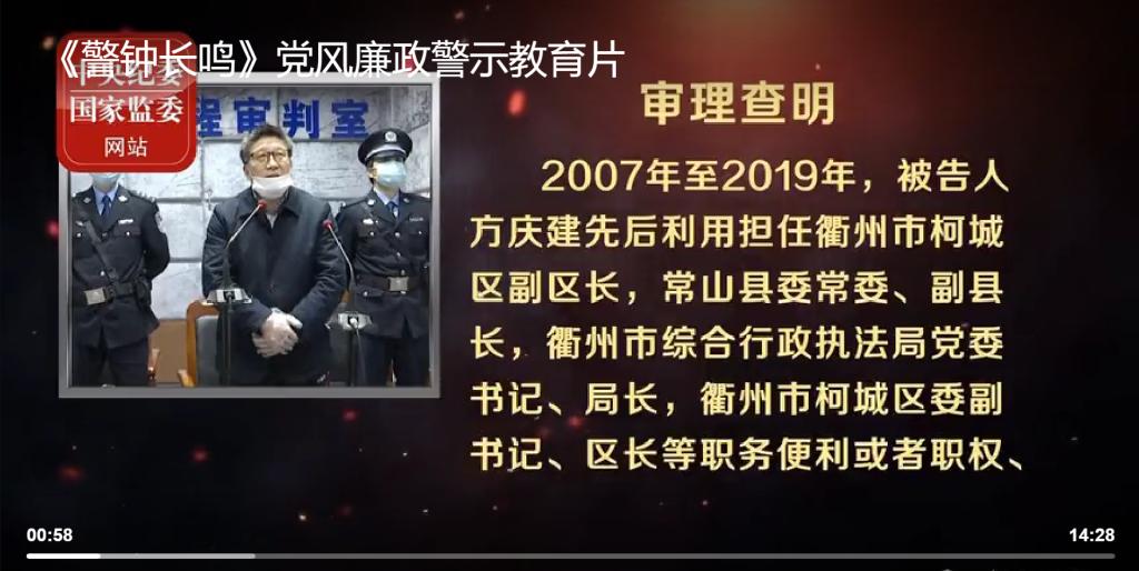 随后,全体人员观看了党风廉政警示教育片《警钟长鸣》。警示片展示了衢州市柯城区副区长方庆建经不住金钱的诱惑,丧失理想信念,无视党纪国法,大肆权钱交易,最终身陷囹圄的犯罪事实。方庆建的狱中忏悔令人无限唏嘘,党员教师们在生动、鲜活的案例面前深受教育,表示在党纪面前始终要知行止、存敬畏,永葆共产党员的初心。