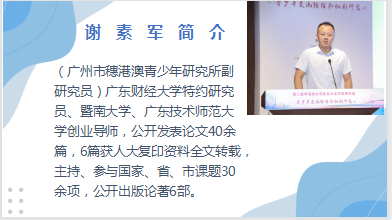 附专家简介:谢素军,广州市穗港澳青少年研究所副研究员,《青年探索》编辑部主任,广东财经大学特约研究员、暨南大学、广东技术师范大学创业导师,公开发表论文40余篇,6篇获人大复印资料全文转载,主持、参与国家、省、市课题30余项,公开出版论著6部。