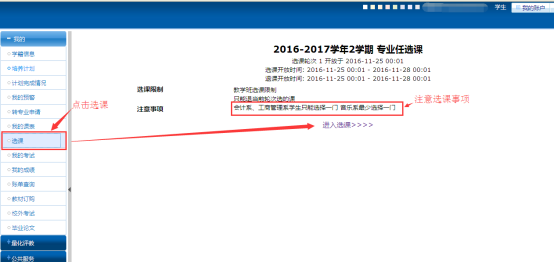 2、首页进入选课:点击左边选课菜单,在右边界面再点击进入选课(图2所示);
