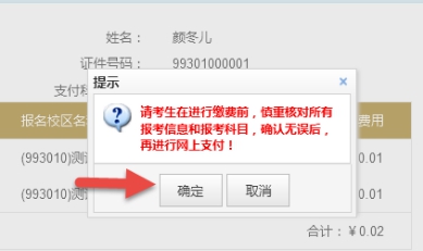(4)页面提示确认报考信息,点击“去支付”,再次提示确认报考信息,点击“确定”,并在12小时内完成缴费。