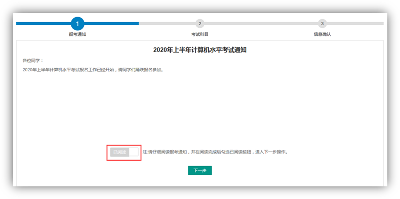 请认真阅读报考通知,并在阅读完成后勾选“已阅读”按钮,进入下一步操作;