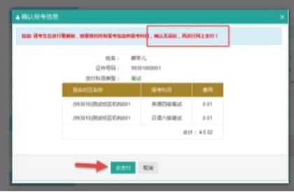 (4)页面提示确认报考信息,点击“去支付”,再次提示确认报考信息,点击“确定”,并在24小时内完成缴费。