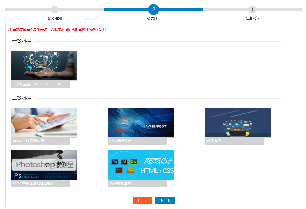 选择报考科目时,注意计算机考试科目只能选择不同级别的任意两门进行考试;选择完成后,点击“下一步”;