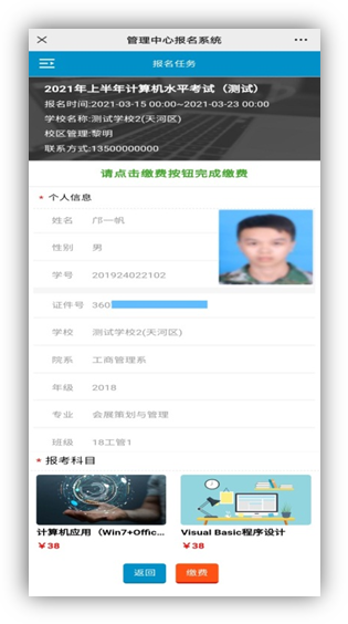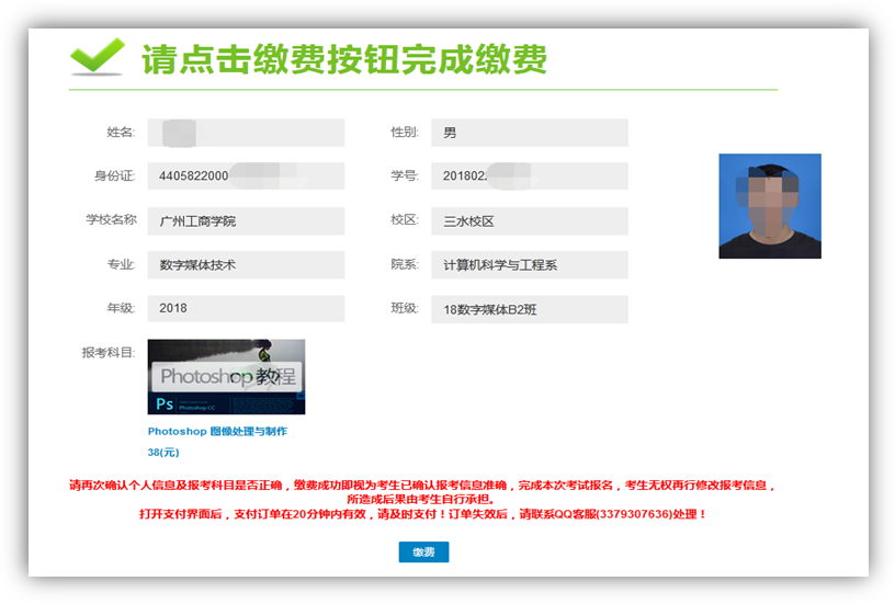 确认个人报名信息无误后,点击“缴费”按钮完成考试报名缴费;