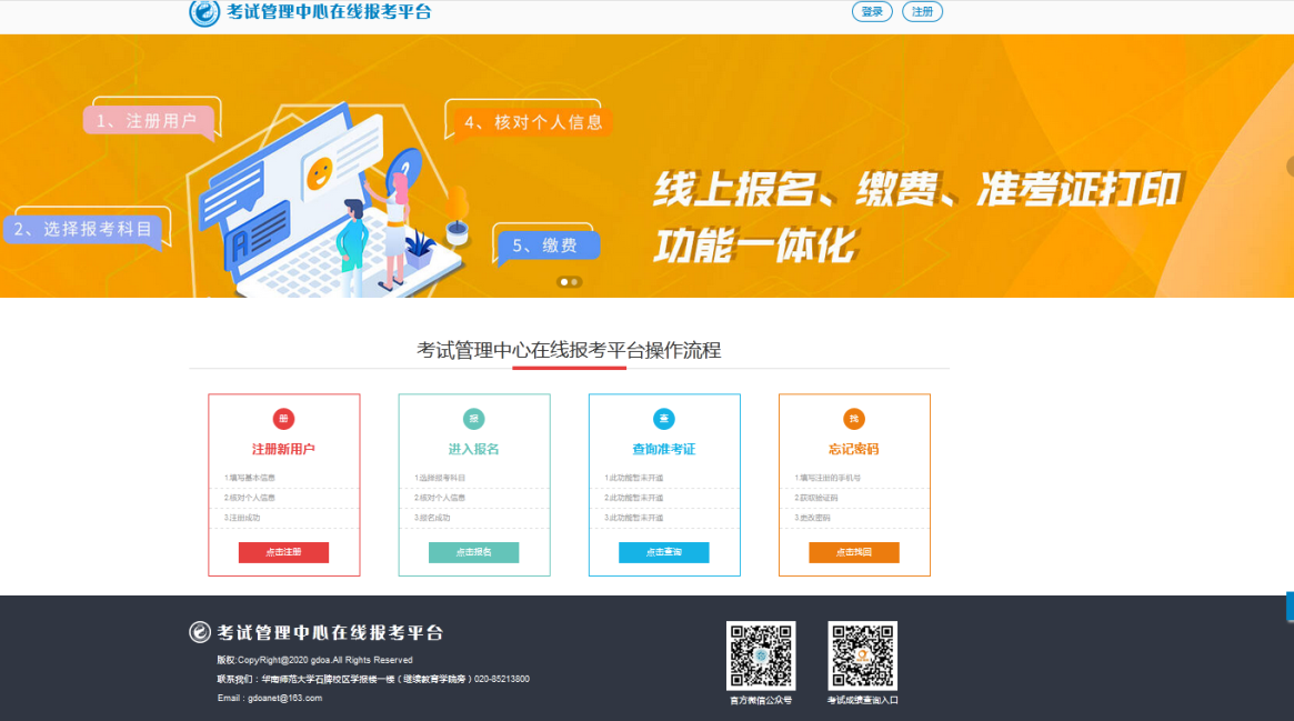 登录考试管理中心在线报考平台,电脑端网址:http://gdoa.scnu.edu.cn/Bm/ ;或用手机微信扫描附件2的二维码登录。报名流程:注册用户--选择报考科目--阅读报名协议--核对个人信息--线上缴费--报名成功。本次缴费使用华南师范大学统一支付平台,学生选择微信或银行卡线上支付,报名和缴费流程详见附件2。