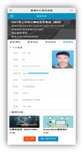 请认真确认个人报名信息及报考科目,如有修改请点击“上一步”,如确认无误,点击“确认”完成报考,一旦选择确认报考成功,将无法修改报考科目;