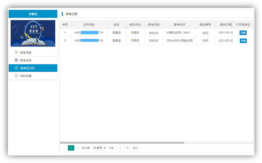 报名成功后,点击“准考证打印”栏目进入可查看报考记录信息;