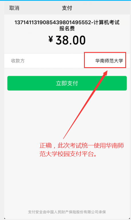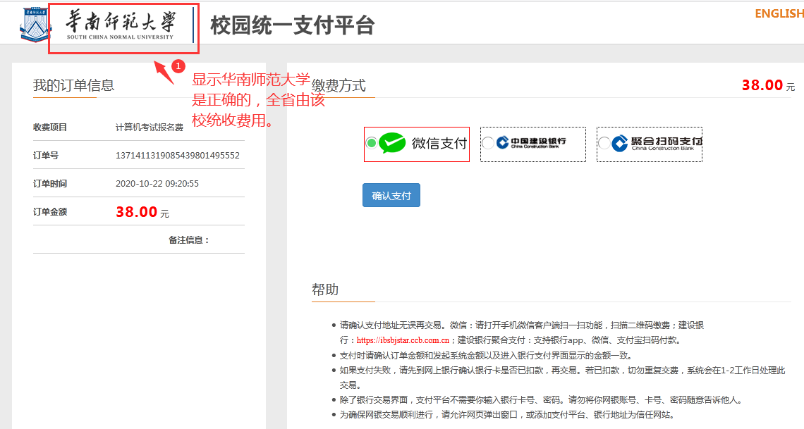 选择缴费方式:本次缴费统一使用华南师范大学的支付平台,进入支付平台界面后选择微信支付或银行卡支付,打开支付界面后,支付订单在20分钟内有效,请及时支付。支付完成后将自动跳转到报名成功界面;如缴费后没有完成自动跳转,请尝试刷新网页或联系QQ客服(3379307636)处理;