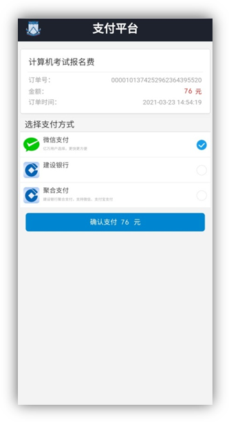 选择缴费方式:选择微信支付或银行卡支付,支付完成后将自动跳转到报名成功界面;如缴费后没有完成自动跳转,请尝试刷新网页或联系QQ客服(3379307636)处理;