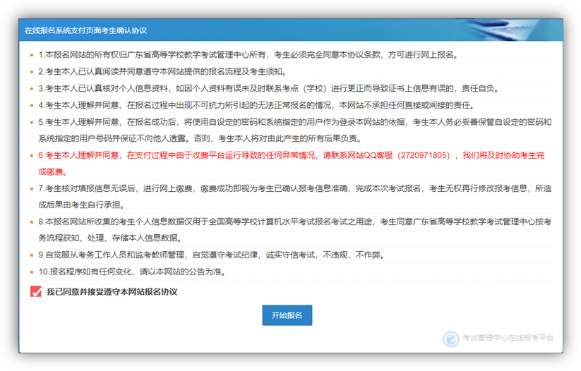 在完成报名缴费操作前,请认真阅读报名协议里面的相关内容,确认并同意后,勾选“我已同意并接受遵守本网站报名协议”,然后点击“开始报名”;
