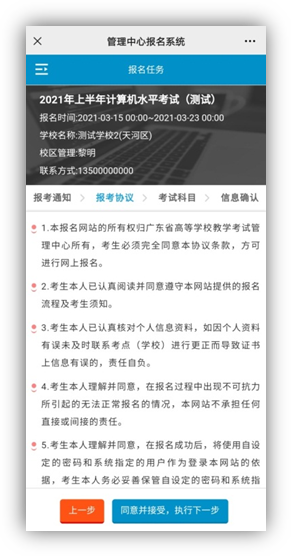 在完成报名缴费操作前,请认真阅读报名协议中的相关内容,确认并同意后,点击“同意并接受,执行下一步”按钮,进入下一步操作;