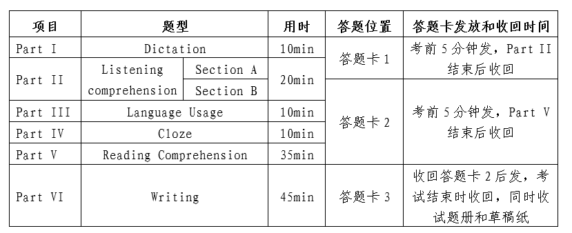 五、考试时考生会收到一份试题册、一张草稿纸和3份答题卡,试题册和草稿纸在考前5分钟发放,答题卡的发放和收回时间详见下表: