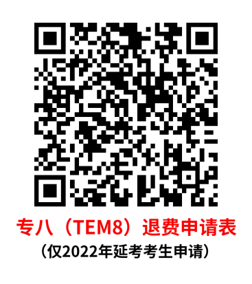 未申请参加2023年TEM考试且未申请退费的2022年TEM延考考生,若放弃参加2024年TEM考试(视为放弃资格,延考资格不再顺延),可申请退还报名费,请在2023年11月27日前扫描下方相应科目二维码填写正确信息申请退费。