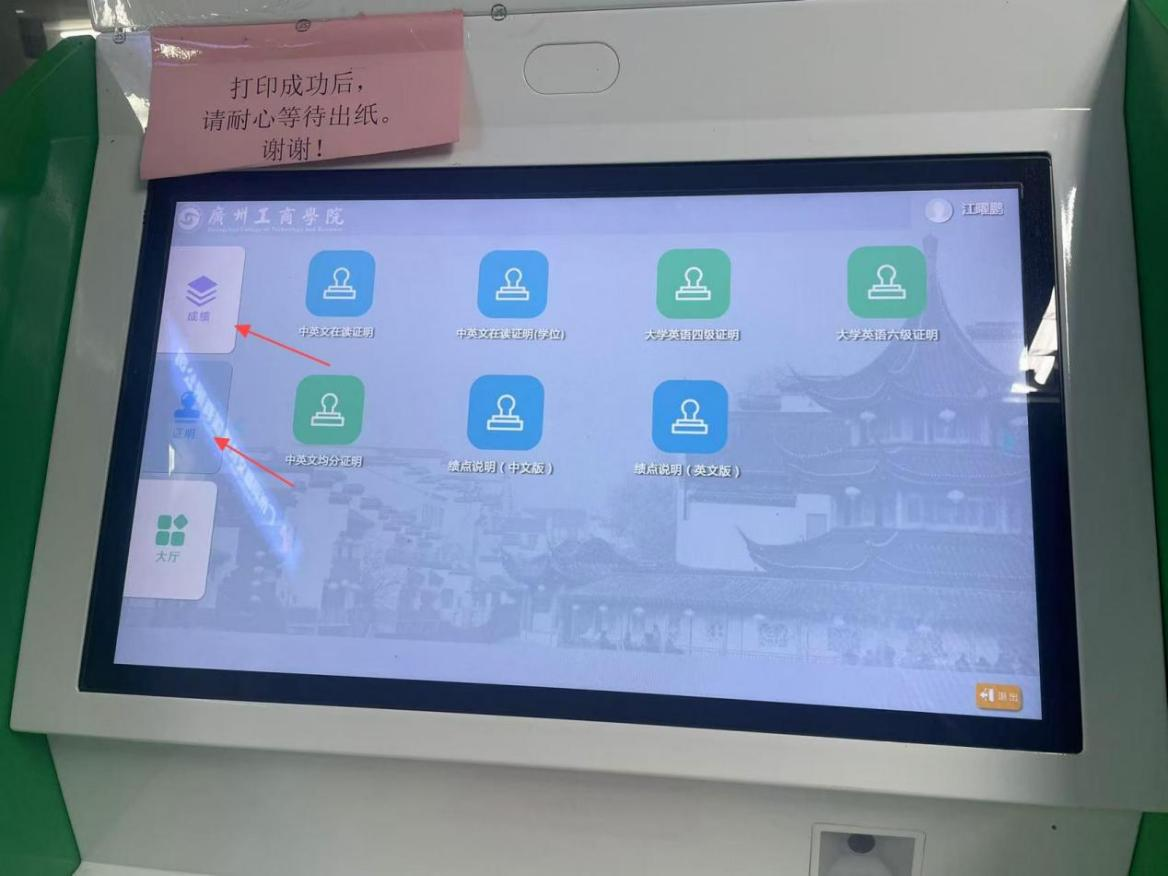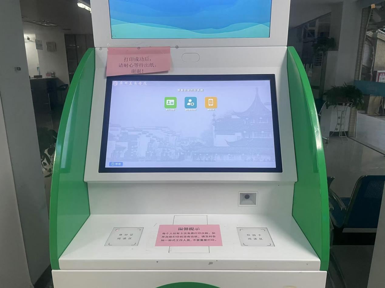 为了方便学生打印成绩单、在读证明等材料,学校在2020年底建设了成绩单自助打印平台,在三水校区和花都校区各设置了自助打印终端,同学们可自行打印相关证明,为同学提供打印成绩单和相关证明的便利。