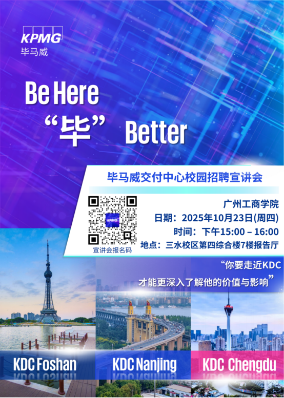 毕马威全球商务服务(广东)有限公司佛山毕马威服务中心(KDC)2025年10月23日15:00-16:00在三水校区第四综合楼7楼报告厅举行招聘宣讲会,请参加的同学提前预约报名