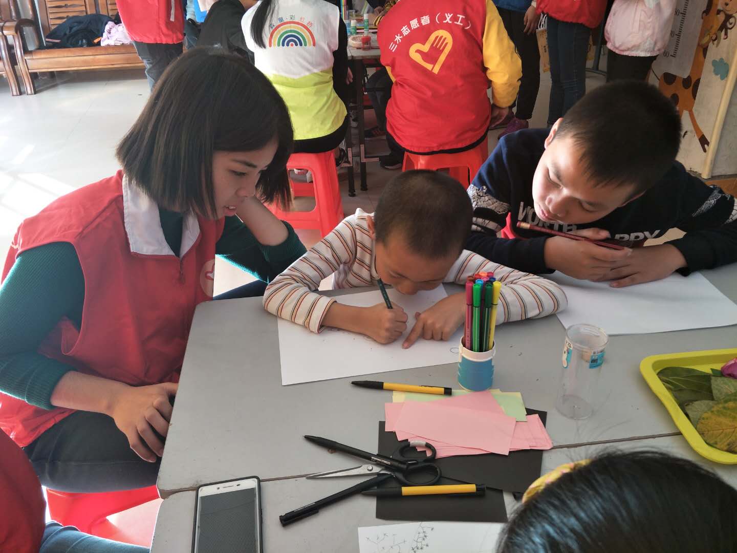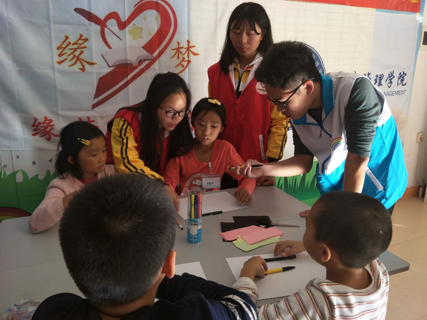 第三节活动的主题是创造与分享,小朋友需要挑战的完成手工画创作--印象西南、制作“我的小小垃圾桶”。缘梦团队的队员引导小朋友进行创作讨论,并协调分工,让他们能互助合作一起完成主题手工创作。在这一过程中,缘梦队员面对个性不一的小朋友,学会了聆听,也学会了从他人的角度看问题。
