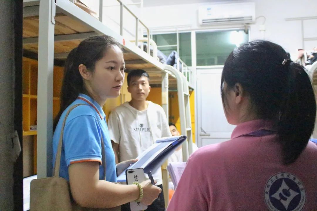 新生报到当晚,2020级新生辅导员就与助班一起前往宿舍看望新生,并发放了电卡与体检表。