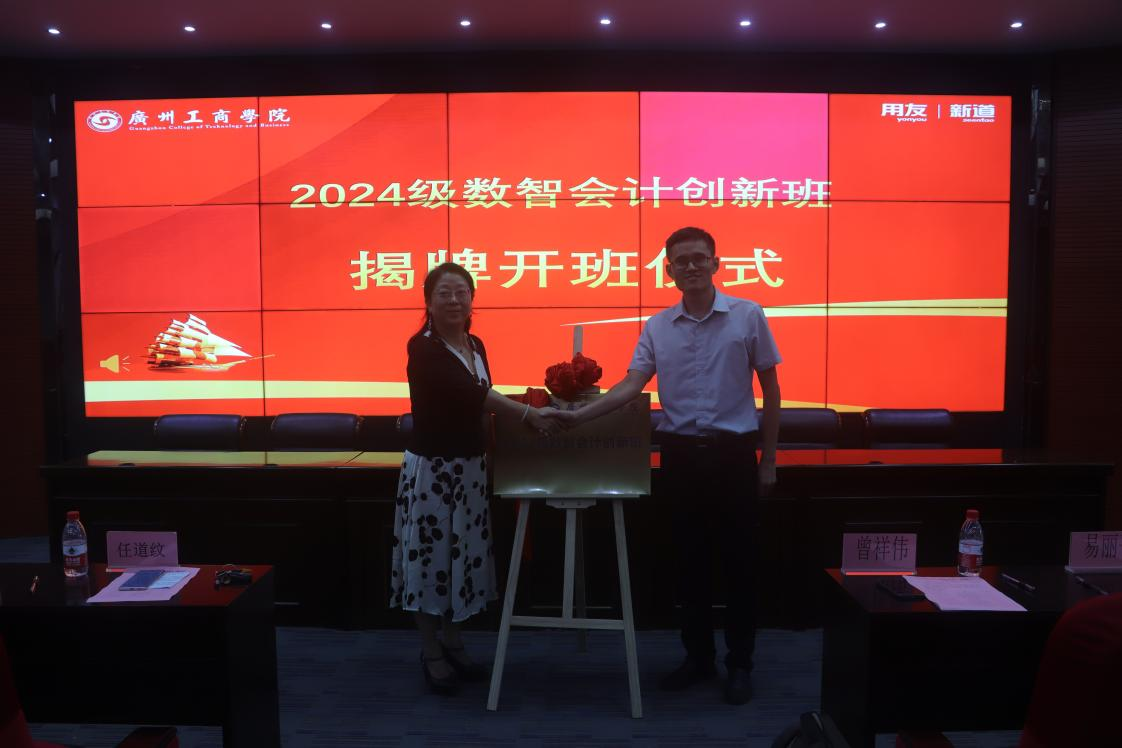 接下来是揭牌开班仪式。新道科技股份有限公司副总经理曾祥伟、会计学院院长任道纹教授共同为2024级数智会计创新班揭牌,标志着2024级数智会计创新班顺利开班。