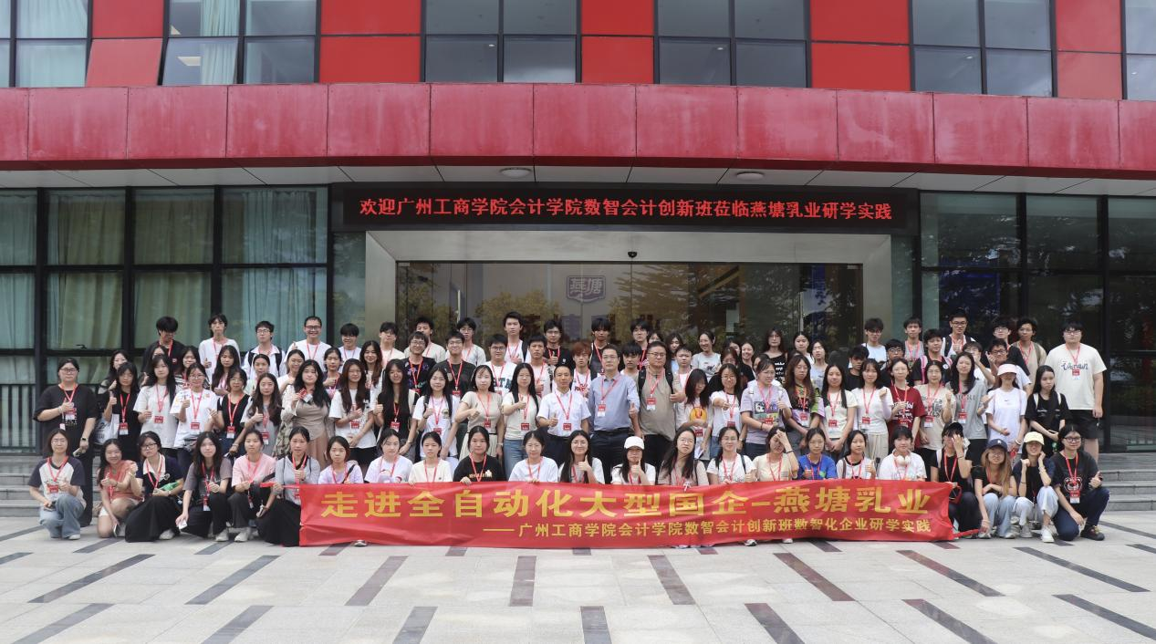 在企业参观环节,学生们依次走访了燕塘乳业全自动智能生产线、企业文化展厅及党建中心。通过实地观察乳制品行业数智化转型下的生产流程和财务管理模式,同学们对智能成本控制、数据监测系统有了直观认识。