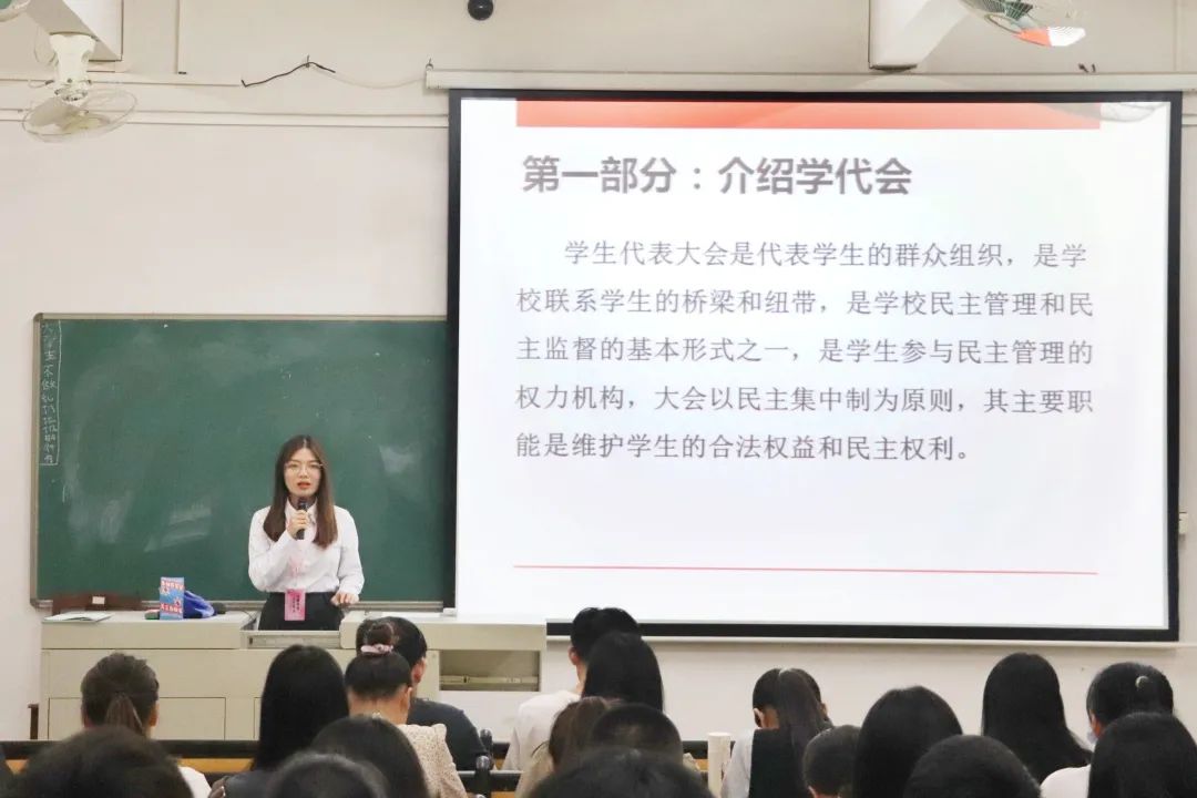 代表推选会进行第一项,由李婉君同学为候选人简要介绍了“学代会”。她提到学生代表大会是代表学生的群众组织,是学校联系学生的桥梁和纽带,其主要职能是维护学生合法权益和民主权利。