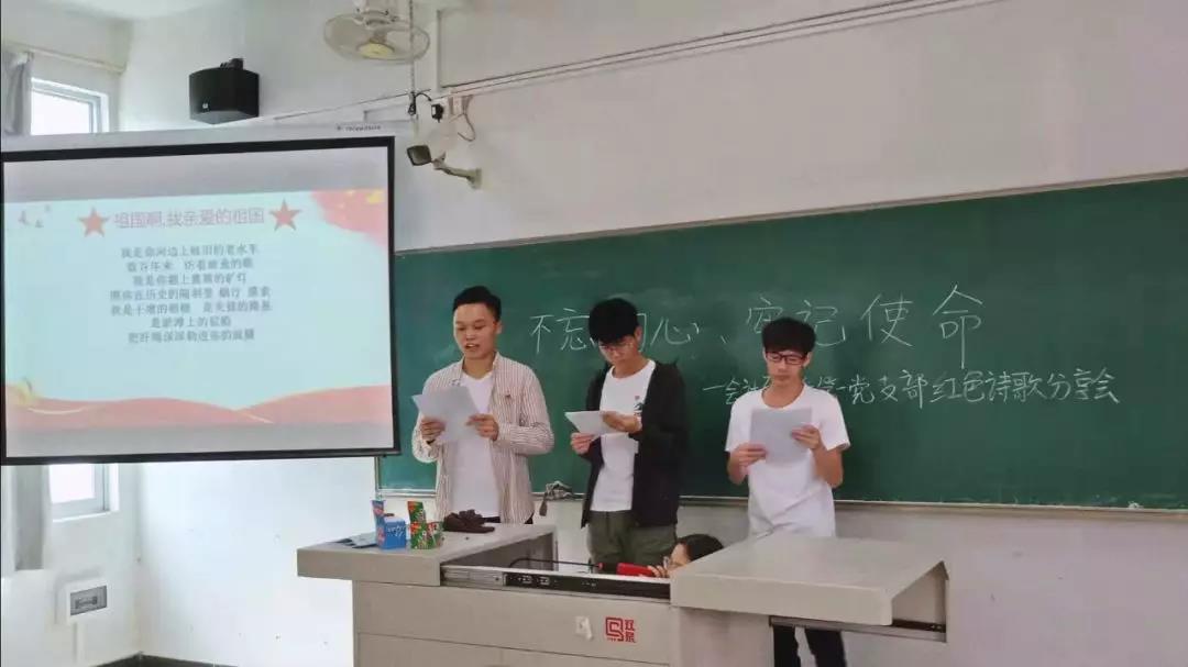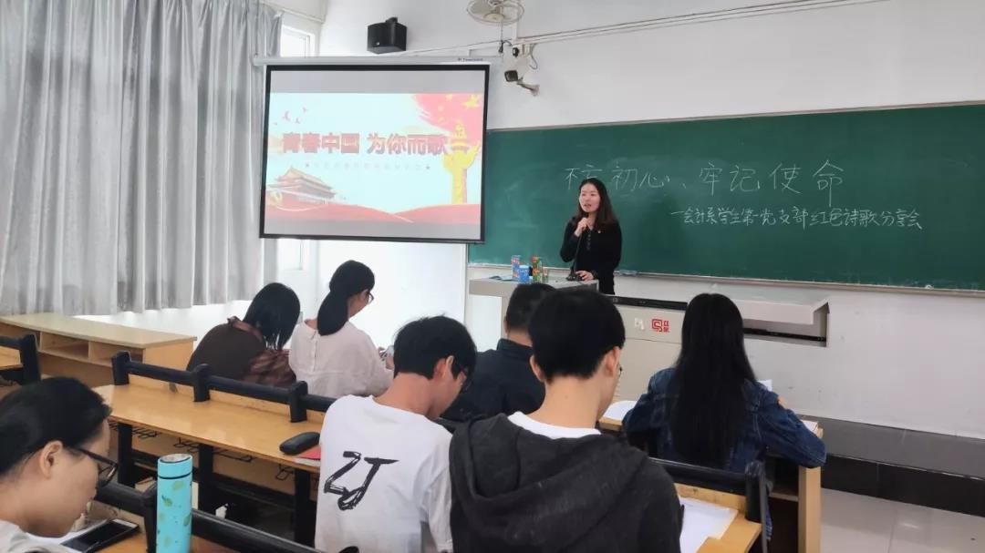 礼赞新中国,讴歌新时代。10月30日,以“青春中国,为你而歌”为主题的红色诗歌朗诵分享会在一教B401举行,活动由聂文莉同志主持,支部党员及预备党员共18人参与。