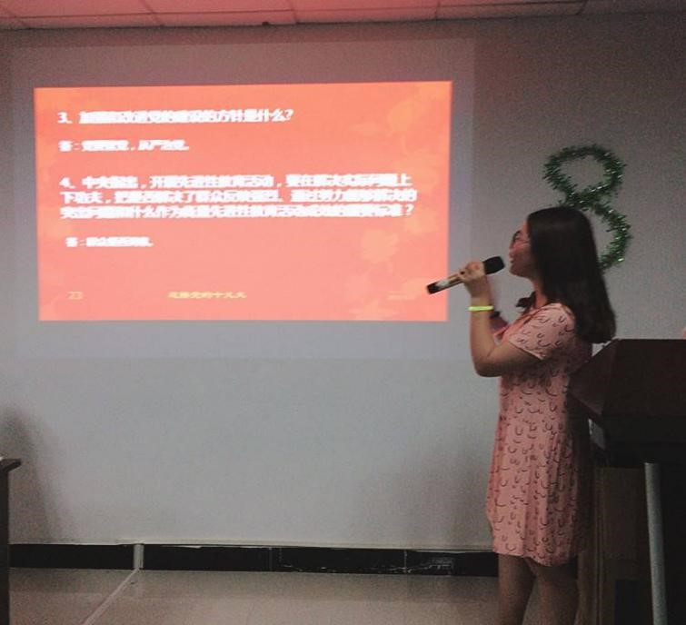 为了能让同学们更加清晰的了解并参与此次的学党知党,团支书思欣同学特地设计了一个有奖竞猜环节。有些知识是平时的新闻中出现的,有些是以前初高中学习过的,所以此时比拼的,就是你对党知识是否铭记于心。同学们激烈的抢答,一问一答地讲班会推向了高潮。
