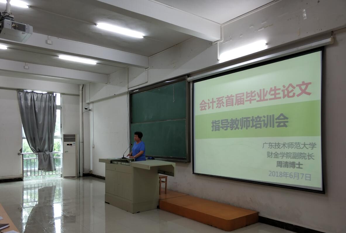 培训会上,系主任程燕教授特别邀请了广东技术师范学院财经学院副院长周清教授、博士对我系全体教师的论文指导工作进行了专业的培训,对论文的开题、格式、撰写内容及撰写标准做了详细的指导和说明,并对论文指导中容易出现的问题和重点关注的问题都做了特别强调,同时根据我系的学生实情,对论文开题时间、撰写时间、查重时间及提交时间都作了具体安排和部署。
