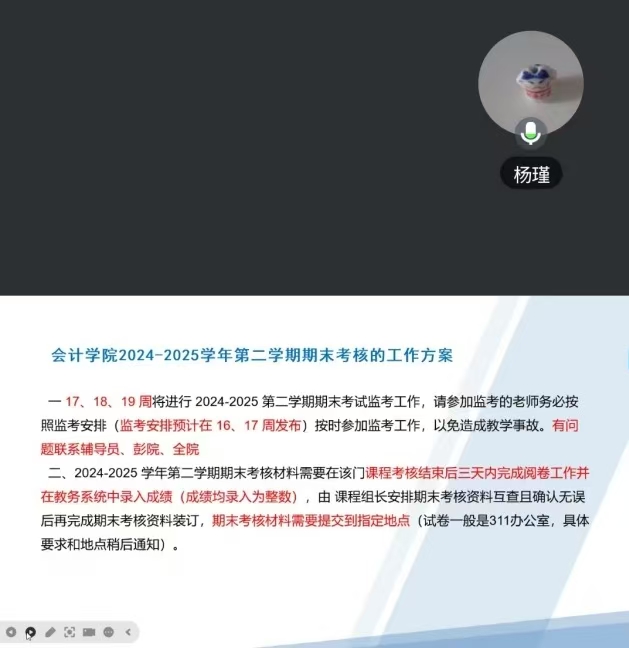 为保障期末各项工作平稳有序推进,2025年6月17日,财务管理教研室召开期末工作部署会议,围绕教学管理、安全规范等核心任务系统部署,确保学期工作圆满收官。会议由教研室主任杨瑾主持,财务管理教研室全体教师、财管课程组组长参会。