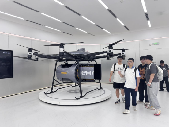 在亿航智能公司的展厅里,全球首款获中国民航局型号合格证、生产许可证、标准适航证“三证”的亿航智能EH216-S载人无人驾驶航空器成为焦点。该飞行器可搭载两名乘客,最高时速达130公里,通过预设航线实现全自动飞行。同学们都激动但有序地近距离观察其16套螺旋桨全备份设计,了解当单桨故障时系统如何自动补足动力,保障飞行安全。“未来我们也许能在小区楼顶就能打‘飞的’,通勤时间也将大大缩短!”讲解员介绍,亿航智能计划年内于广州、深圳等城市开通“空中公交”试点,这将是我国低空经济从试点迈向商业化的重要里程碑。从“无人机表演”到“空中公交”,亿航智能公司的商业化探索,也预示着我国低空经济“载人时代”序章正式开启。