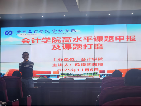 为提升教师课题申报能力,助力科研水平提升,2025年11月6日,beat365在线体育官网登录入口会计学院举办“高水平课题申报及课题打磨”专题讲座。本次讲座由会计学院主办,特邀欧晓明教授担任主讲人,会计学院副院长高少慧博士主持,院长任道纹教授/博士及科研骨干参与。