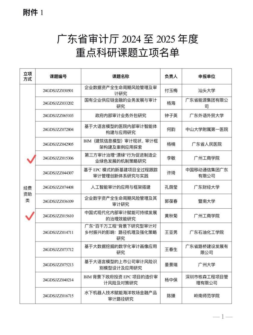 根据广东省审计厅的《广东省审计厅关于2024至2025年度重点科研课题立项的通知》,会计学院李敏副教授主持的课题《第三方审计治理“漂绿”行为促进制造企业绿色发展的机制策略研究》、黄秋菊博士主持的课题《中国式现代化内部审计赋能可持续发展的治理效能研究》荣获批立项。