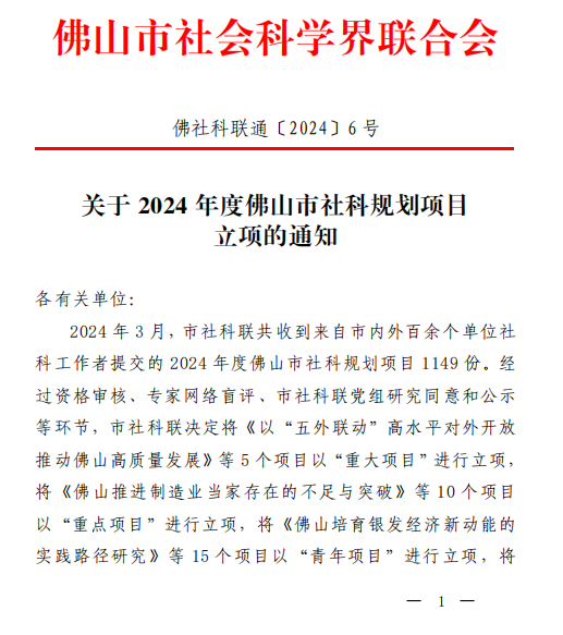 近日,佛山市社会科学界联合会公布了2024年度佛山市社科规划项目结项评审结果,我院获共建项目立项8项,创历史新高。