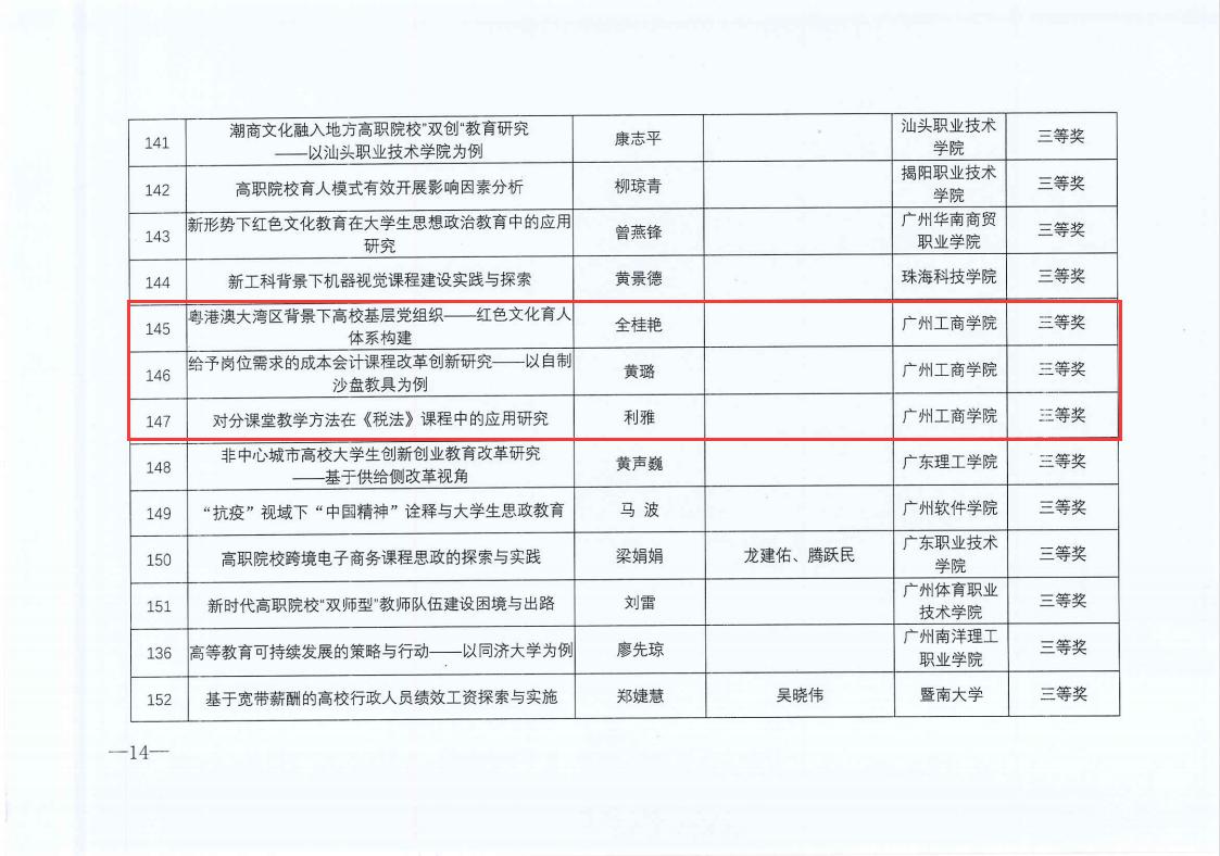 广东省高等教育学会高等教育研究优秀成果奖以学术论文、学术专著、咨询与调研报告等为主要成果形式,是衡量高校教育科研质量的重要指标。本次广东省高等教育学会第二届高等教育研究优秀成果奖的获奖,标志着我院教师的学术论文质量逐步提高。