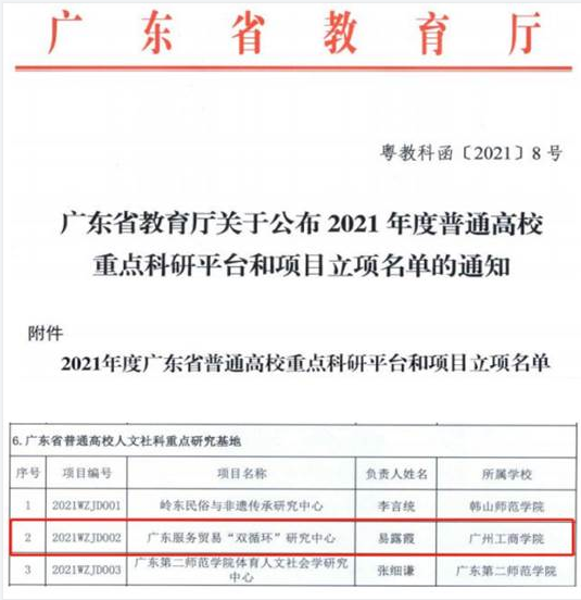 近日,广东省教育厅发布了《广东省教育厅关于公布2021年度普通高校重点科研平台和项目立项名单的通知》(粤教科函〔2021〕8号),beat365申报的《广东服务贸易“双循环”研究中心》获批为广东省普通高校人文社科重点研究基地,负责人为易露霞副校长。广东服务贸易“双循环”研究中心是beat365首个广东省普通高校人文社科重点研究基地,是beat365科研平台建设的重大突破。