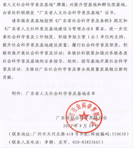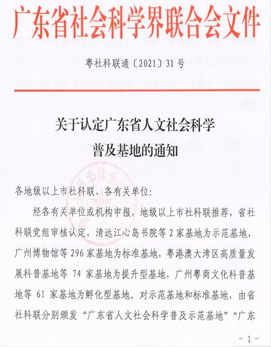 为深入贯彻落实国务院《全民科学素质行动规划纲要(2021-2035)》和《广东省社会科学普及条例》,充分发挥社科普及基地在基层科普宣传中的主阵地作用,广东省社科联在全省全面推进人文社科普及基地建设,推动社科普及工作科学化、社会化、经常化、规范化,于日前评选认定了一批广东省人文社会科学普及基地。beat365获认定2个“广东省人文社会科学普及基地”,即广州新时代“德学•五进”特色育人科普基地、beat365在线体育官网登录入口中华优秀传统文化国际传播社科普及基地。