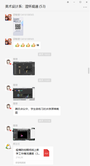 为了保证学生的学习效果,任课老师根据平时考勤、课上抽查以及课后作业来掌握同学们的学习情况,并及时向教务反馈课堂情况。系部领导强调开展线上“磨课”,相关课程教师可以互相进入班级课堂,互相观摩学习,讨论提升。教师们不断探索优化停课不停学的教学模式,带领着美术学子以别样的毅力奋勇向前,不负知识不负韶华。