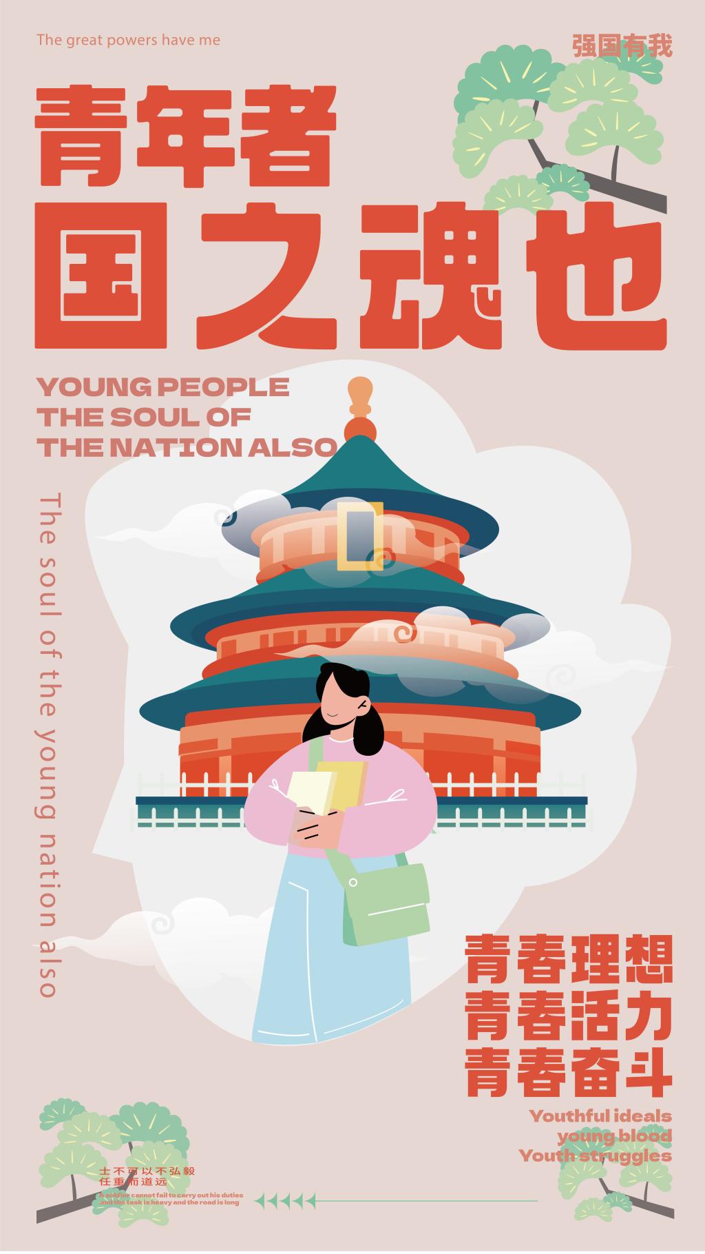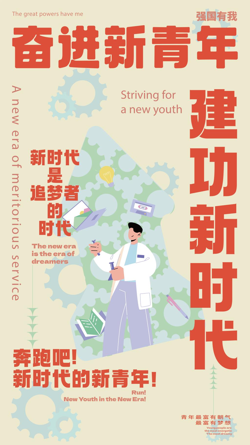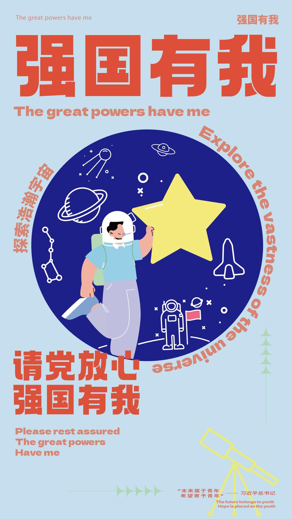 在庆祝中国共产党成立100周年大会上,青年代们表在北京天安门广场集体致献词。中国青年是有远大理想抱负和有伟大创造力的青年。无论过去、现在还是未来,中国青年始终是实现中华民族伟大复兴的先锋力量!而作为新一代青年大学生的我们要有理想有担当,要奋发有为践行“强国有我,请党放心”的铮铮誓言。所以选用“强国有我”为主题和选用了太空,科学,知识三个元素绘制了三张系列海报。作品内容和主题积极向上。海报中所使用的元素既体现了强烈的时代感,生动象形地表现了beat365青年大学生积极向上的精神面貌和真挚的爱国之情。