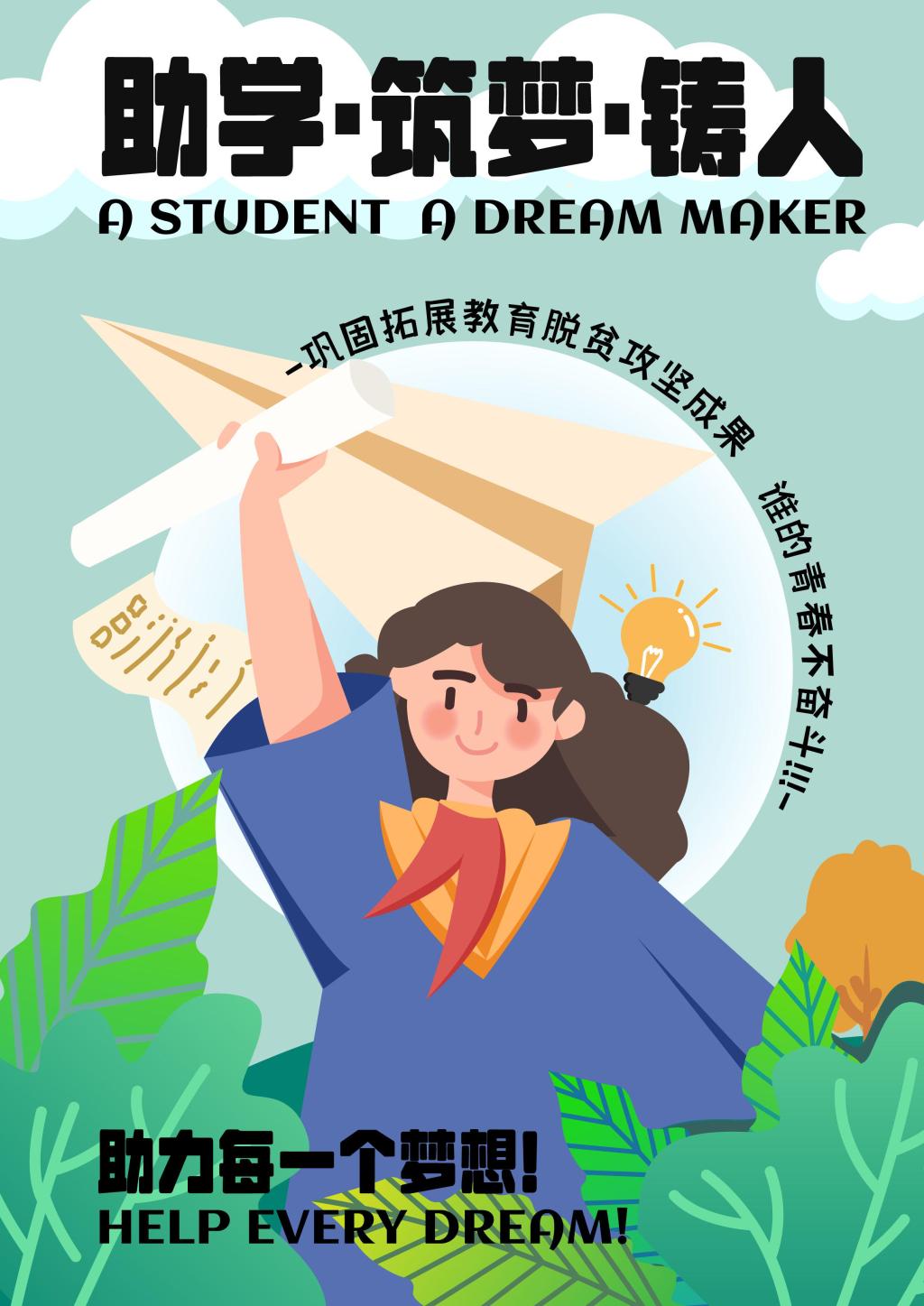 以国家高校资助为主题,表达"助学.筑梦.铸人"的初心,反应了资助政策的重要性,不仅在物质上给了学生帮助,还给了学生继续追梦的底气,在精神方面树立了自信。以及我们对党,对国家的热爱和感恩。