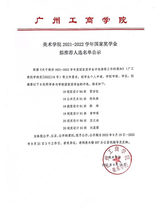 根据《关于做好2021-2022学年度国家奖学金评选推荐工作的通知》(广工商院学助发[2022]18号)等文件要求,经学生个人申请,学院审核、评议,拟推荐以下6位同学参与学校国家奖学金的评选,排名如下: