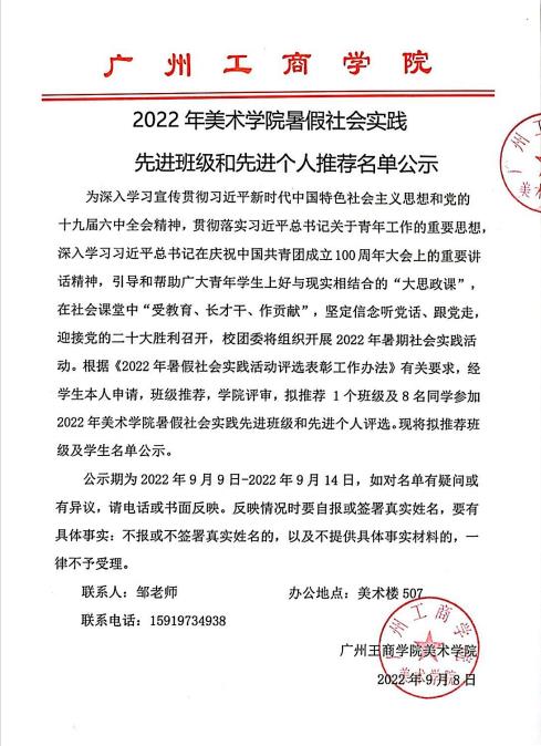 美术学院2022年暑假社会实践先进班级和先进个人推荐名单公示