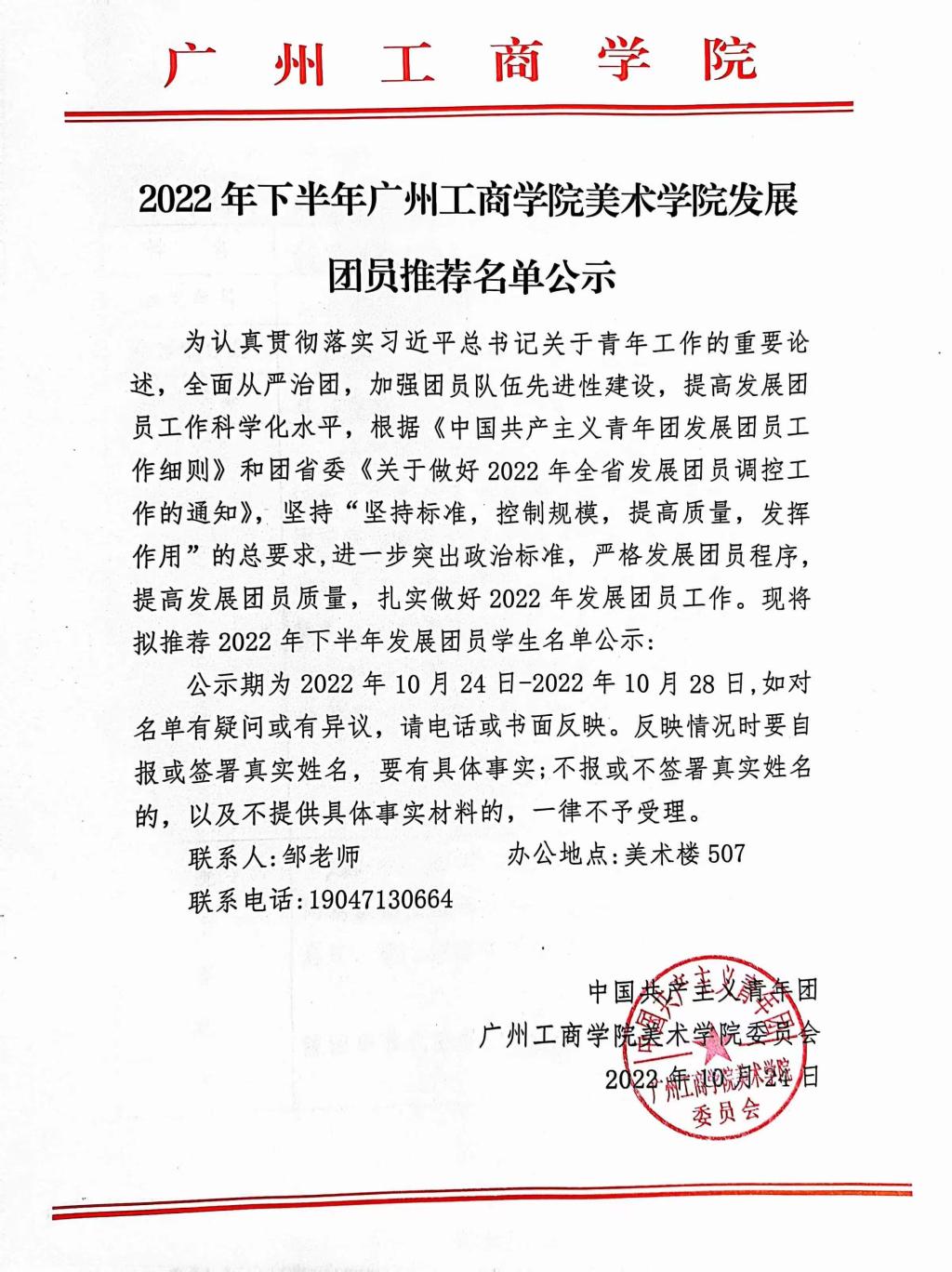 为认真贯彻落实习近平总书记关于青年工作的重要论述,全面从严治团,加强团员队伍先进性建设,提高发展团员工作科学化水平,根据《中国共产主义青年团发展团员工作细则》和团省委《关于做好2022年全省发展团员调控工作的通知》,坚持“坚持标准,控制规模,提高质量,发挥作用”的总要求,进一步突出政治标准,严格发展团员程序,提高发展团员质量,扎实做好2022年发展团员工作。现将拟推荐2022年下半年发展团员学生名单公示: