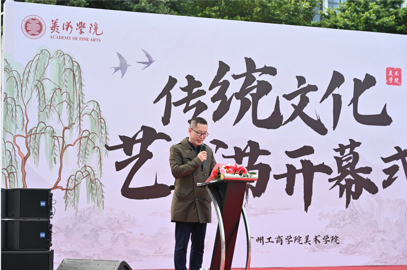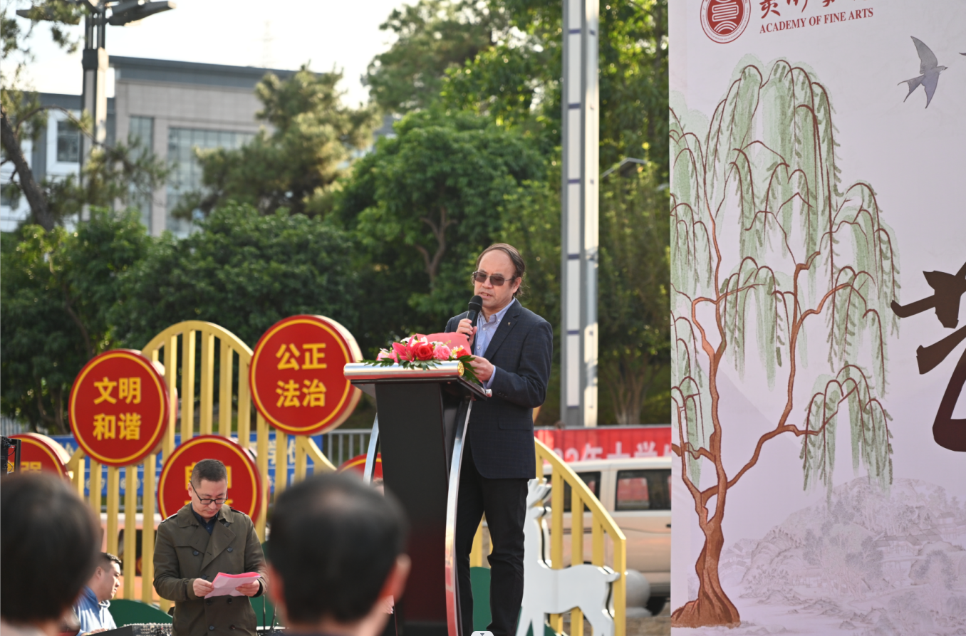 美术学院院长徐浩艇致欢迎辞。他代表美术学院向应邀出席本次开幕式的各位领导、老师及同学们表示热烈的欢迎。向一直关心和支持美术学院各项工作的各位领导和精心筹备本次艺术节的老师和同学们表示衷心的感谢。