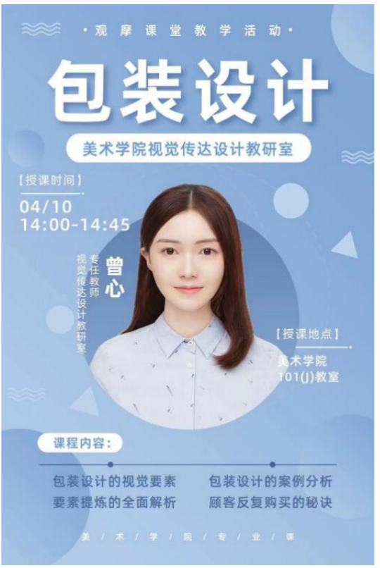 2024年4月10日下午,花都校区美术学院101(J)教室举办了一场《包装设计》观摩课活动。此次活动由美术学院视觉传达教研室组织,曾心老师担任主讲,教研室主任王晶老师担任主持人,美术学院郝孝华副院长和教学督导燕林教授也亲临现场指导,此外,还有12名专任教师教师进行课堂观摩。