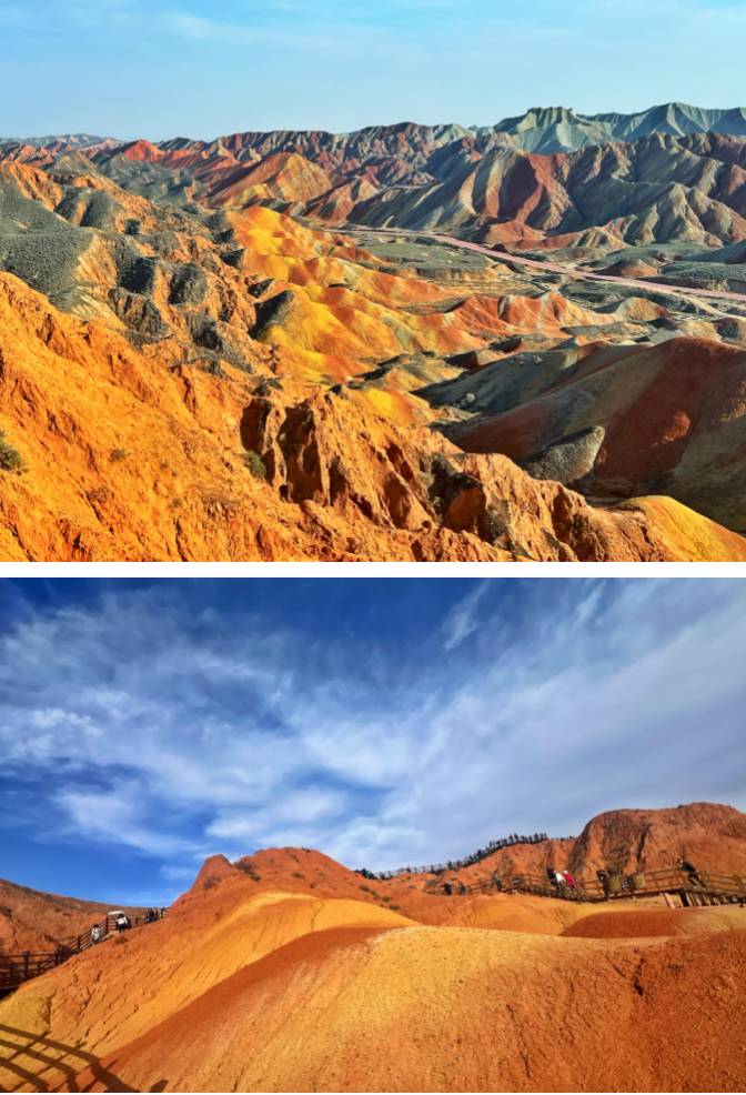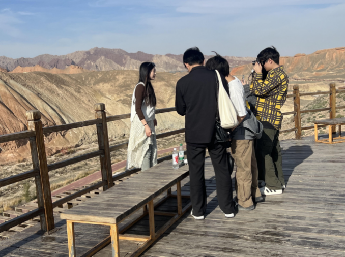 接下来学生还参观了张掖七彩丹霞国家地质公园。这里被《中国国家地理》评为“中国最美的七大丹霞地貌之一,是国内唯一的丹霞地貌与彩色丘陵景观高度复合区,色彩缤纷、观赏性强、面积大,集雄、险、奇、幽、美于一身。起伏的彩色山体如同霓虹泼洒在大地之上,又如彩带飘落,瑰丽磅礴。同学们不由的惊叹于自然造化之神奇,