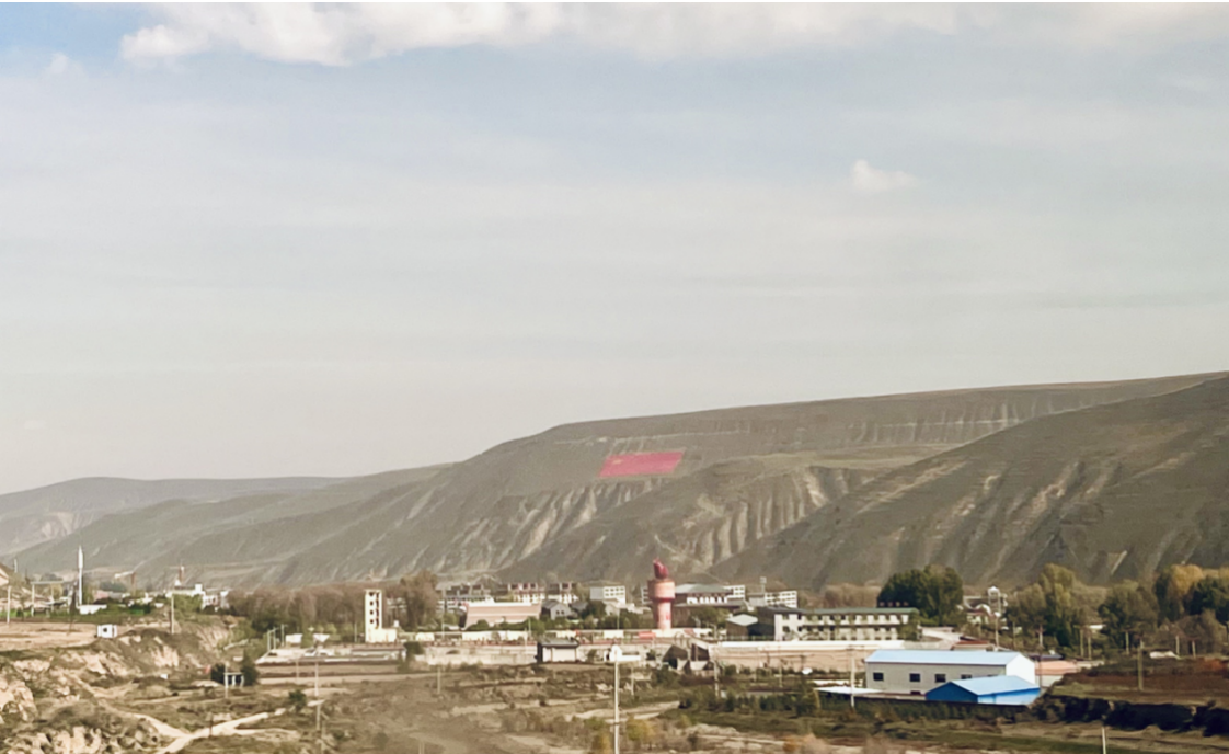 途经古浪战役纪念区,远山上五星红旗图案在阳光照耀下熠熠生辉,学生们聆听着先烈的英勇事迹,向英雄们表达敬意。