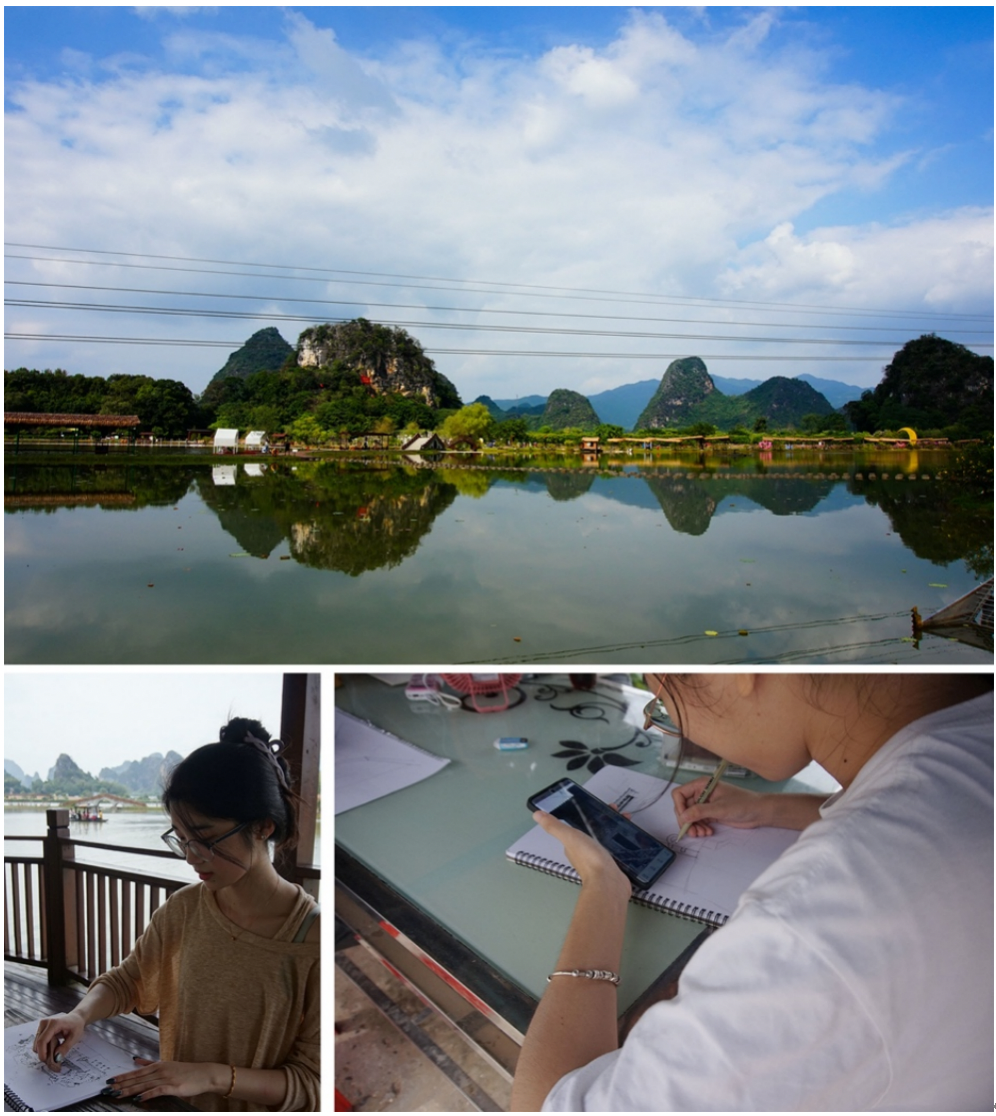 下午师生前往峰林晓镇。这里以壮观的喀斯特地貌和田园风光闻名,被称为“小桂林”。十月的广东依然温暖湿润,峰林晓镇的植被茂密,山间绿意盎然。峰林间,河流蜿蜒,山峰错落有致,构成了秋日的天然画卷,学生们在这里展开了另一场写生活动。